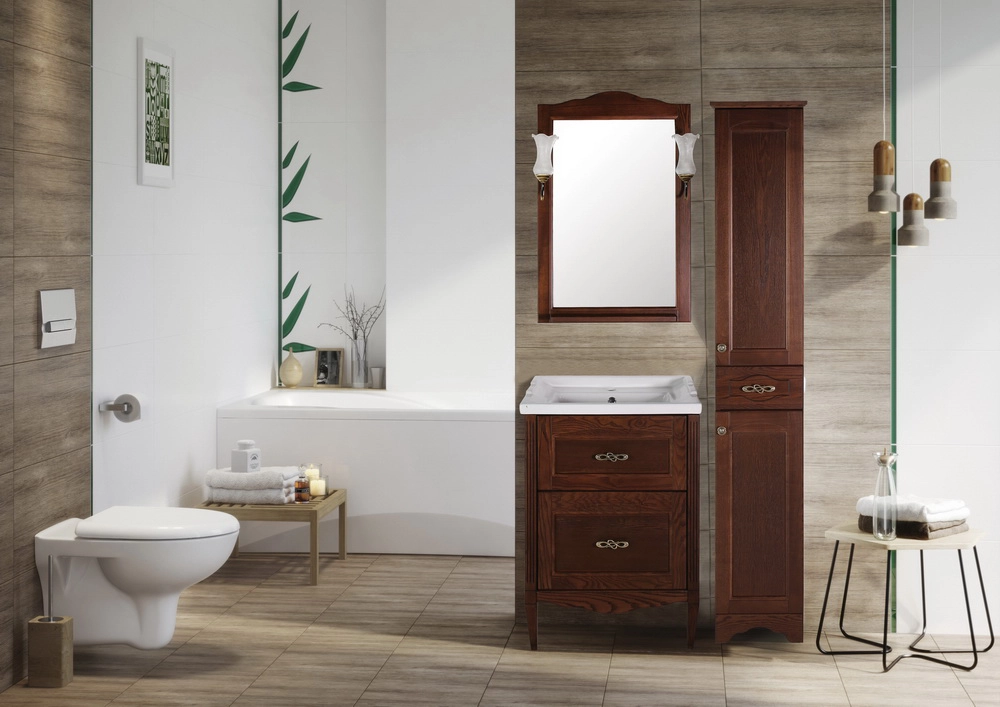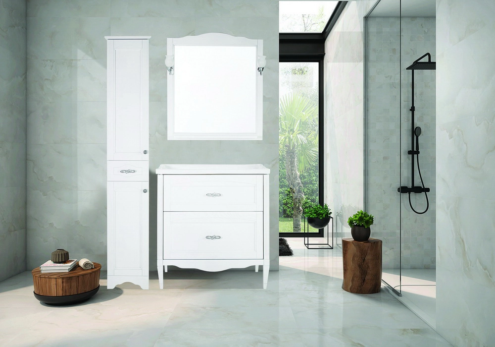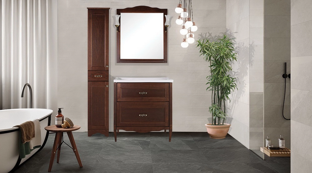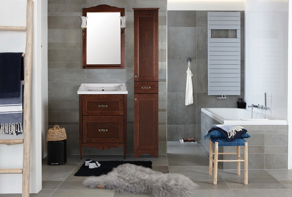 Коллекция мебели «Римини Нуово» для ванной комнаты включает в себя напольные тумбы шириной 60 мм и 80 мм с выдвижными ящиками, настенное зеркало с лампами, керамическую раковину и напольный пенал (колонку) с двумя отделениями и небольшим выдвижным ящиком. Фасады тумбы и колонки выполнены из натурального массива ясеня, внутренние части из влагостойкого МДФ.