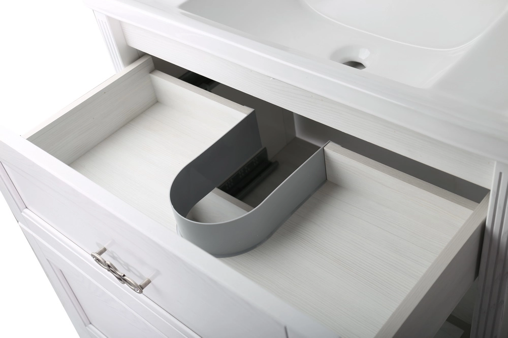 Ящики снабжены направляющими для плавного хода и выдвигаются из корпуса на всю длину. В верхнем ящике есть разделение на две зоны для хранения разных предметов. Дверцы пенала оснащены доводчиками, открываются мягко и бесшумно. В комплекте с пеналом идут стеклянные полочки.