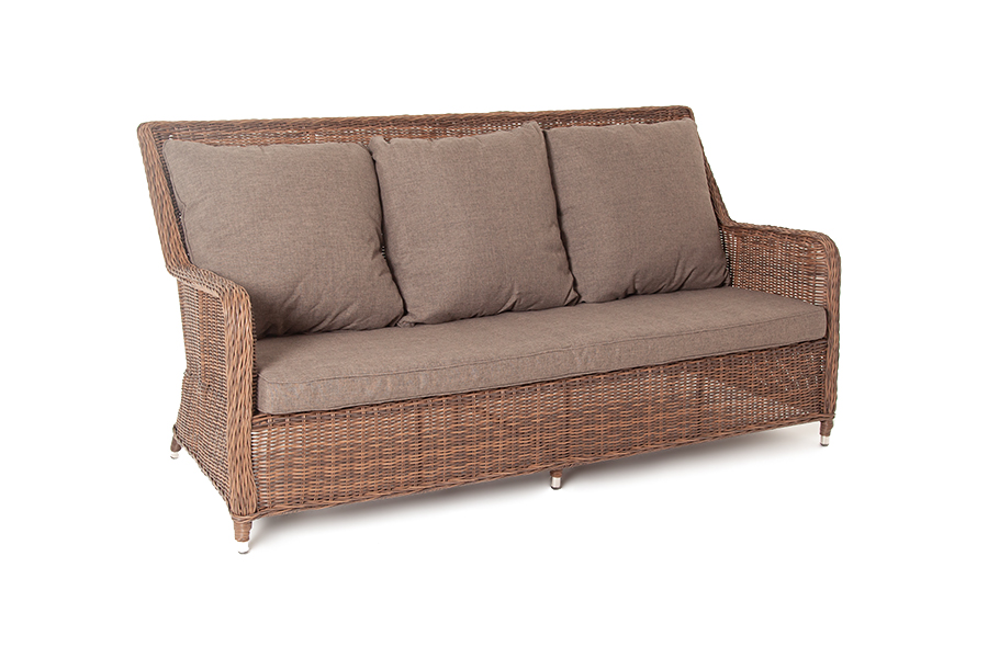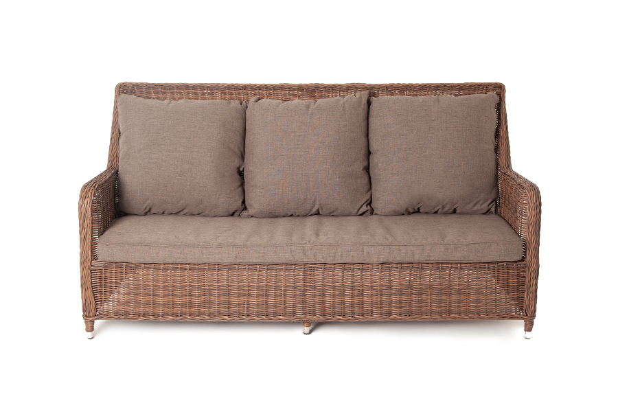 Диван из искусственного ротанга "Глиссандо" оснащен каркасом из алюминия, оплетенного круглым искусственным ротангом коричневого цвета. Размер дивана - 1900×880×990 мм. Подушки и матрас со съемными чехлами, обработаны влагооталкивающими средствами, подлежат машинной стирке.