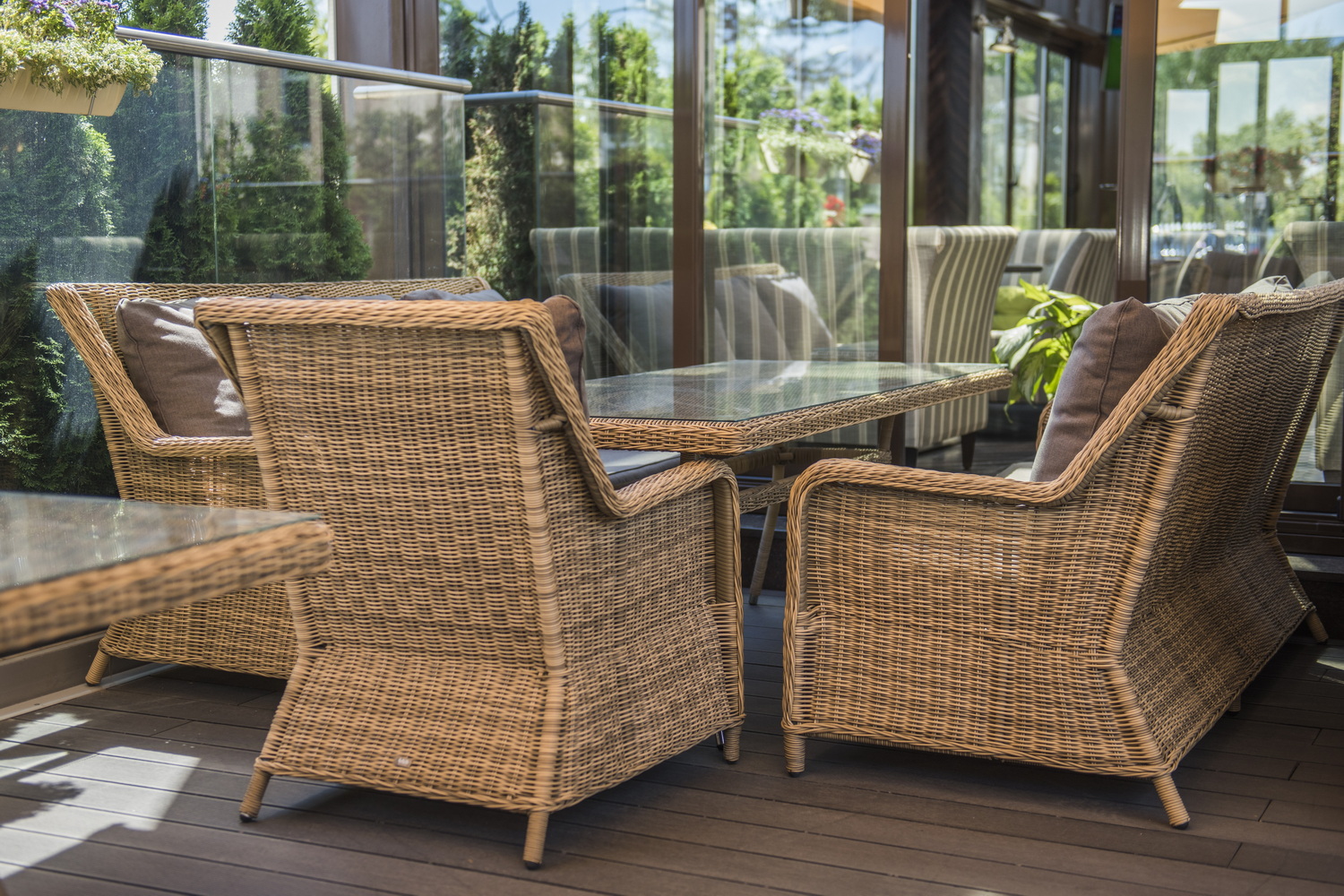 Кресло "Глиссандо" предназначено для комфортного времяпровождения в зоне отдыха с диванами и столиком из этой же серии. Размер модели – 730×880×990 мм. Каркас мебели сделан из прочного алюминия с высокими эксплуатационными качествами. Оплетен вручную с помощью круглого искусственного ротанга. Представлено в соломенном оттенке. Садовое кресло укомплектовано удобными серо-коричневыми подушками. Полиэстер используется при пошиве тканевых изделий, плотность которого - 230гр/м2. Материал имеет обязательную влагоотталкивающую пропитку для усиления его защитных свойств.