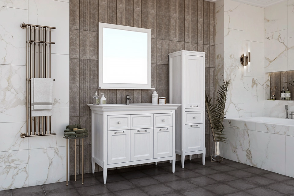 «Гранда» – это дизайнерская коллекция мебели для ванной комнаты в классическом стиле. В коллекцию входят тумба и пенал для напольной установки, керамическая раковина и зеркало со шкафчиком. Каждый предмет можно приобрести отдельно.