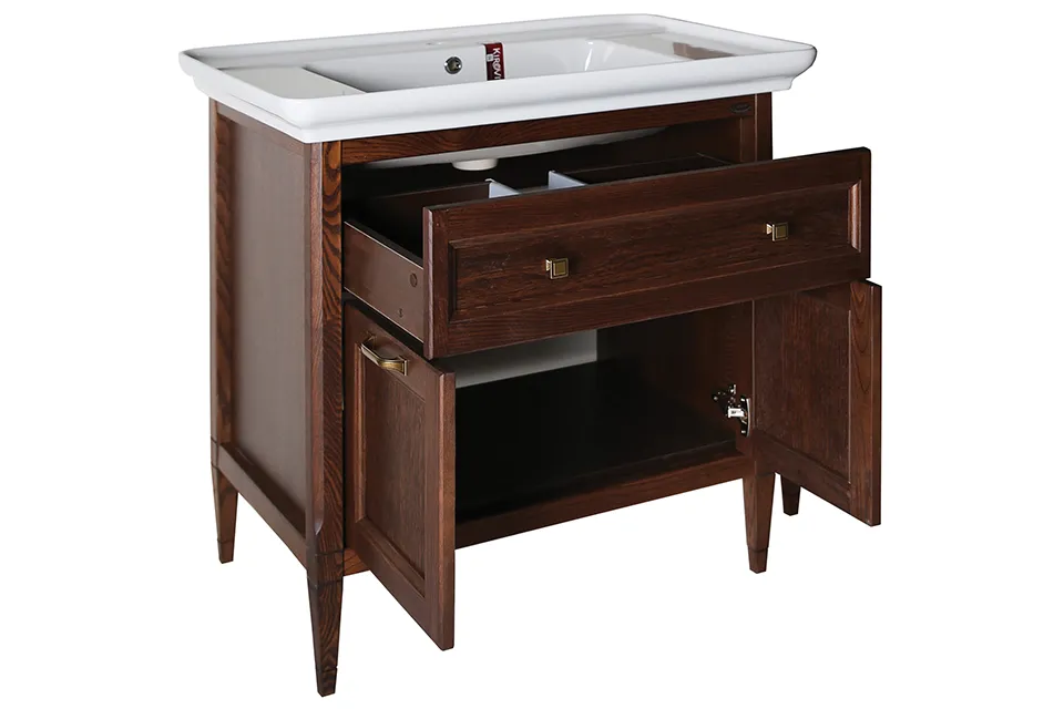 Предлагаются раковины и тумбы разного размера, шкафы с правым или левым расположением петель. Дверцы и ящики оснащены европейской фурнитурой, открываются и выдвигаются плавно, без хлопков. Корпуса и фасады сделаны из натурального дерева (массив ясеня) и покрыты матовым лаком. Стенки ящиков сделаны из МДФ. На ручки нанесено стойкое матовое покрытие с эффектом состаривания.
